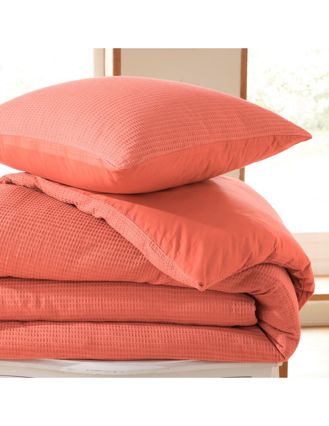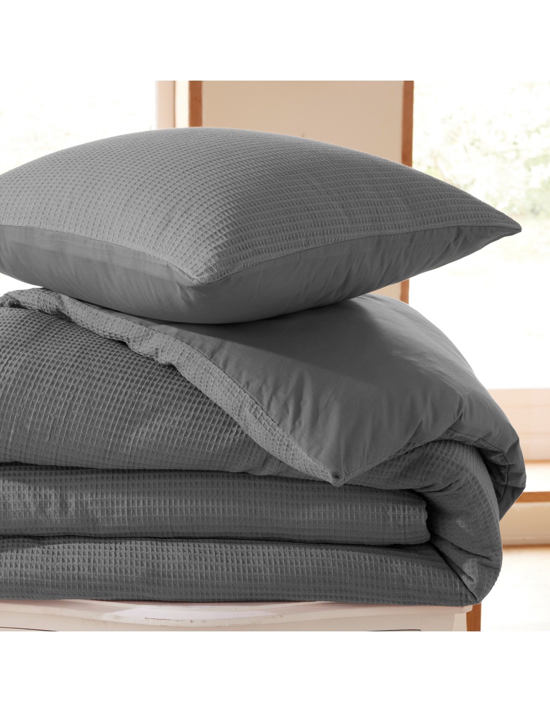 En coton nid d'abeille, une matière légère, fluide et qui donne du relief et de la douceur à votre chambre.