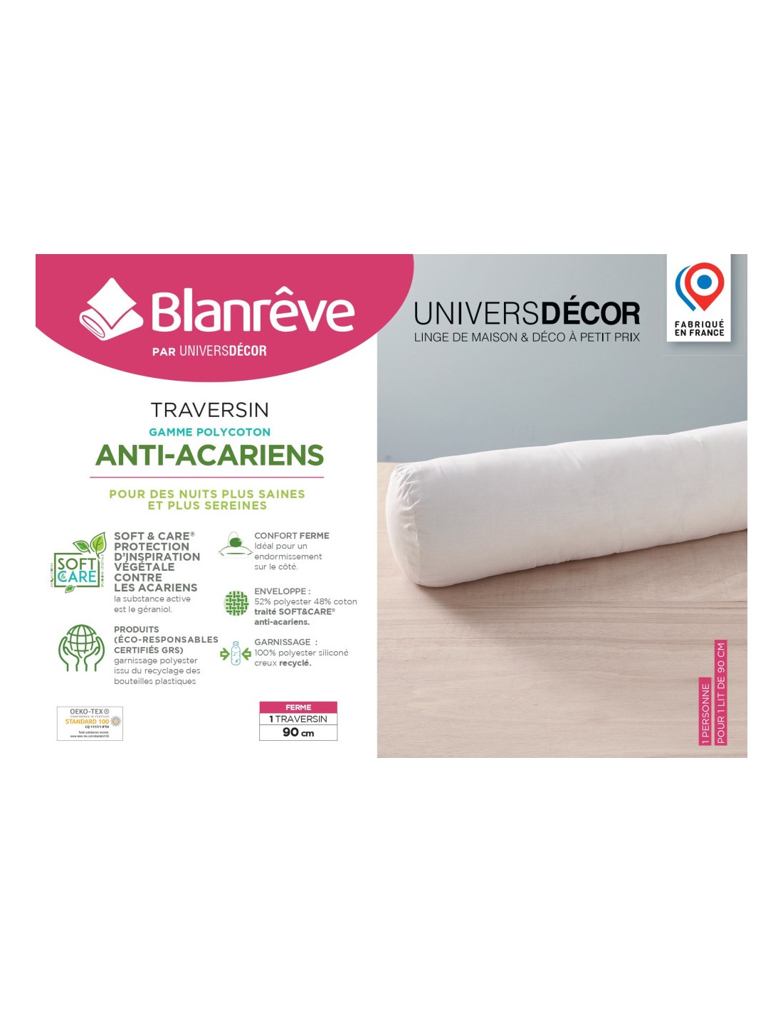 Polochon Gamme Poly coton "Confort" lit 90 x 190 cm traité Anti Acarien Soft & care.