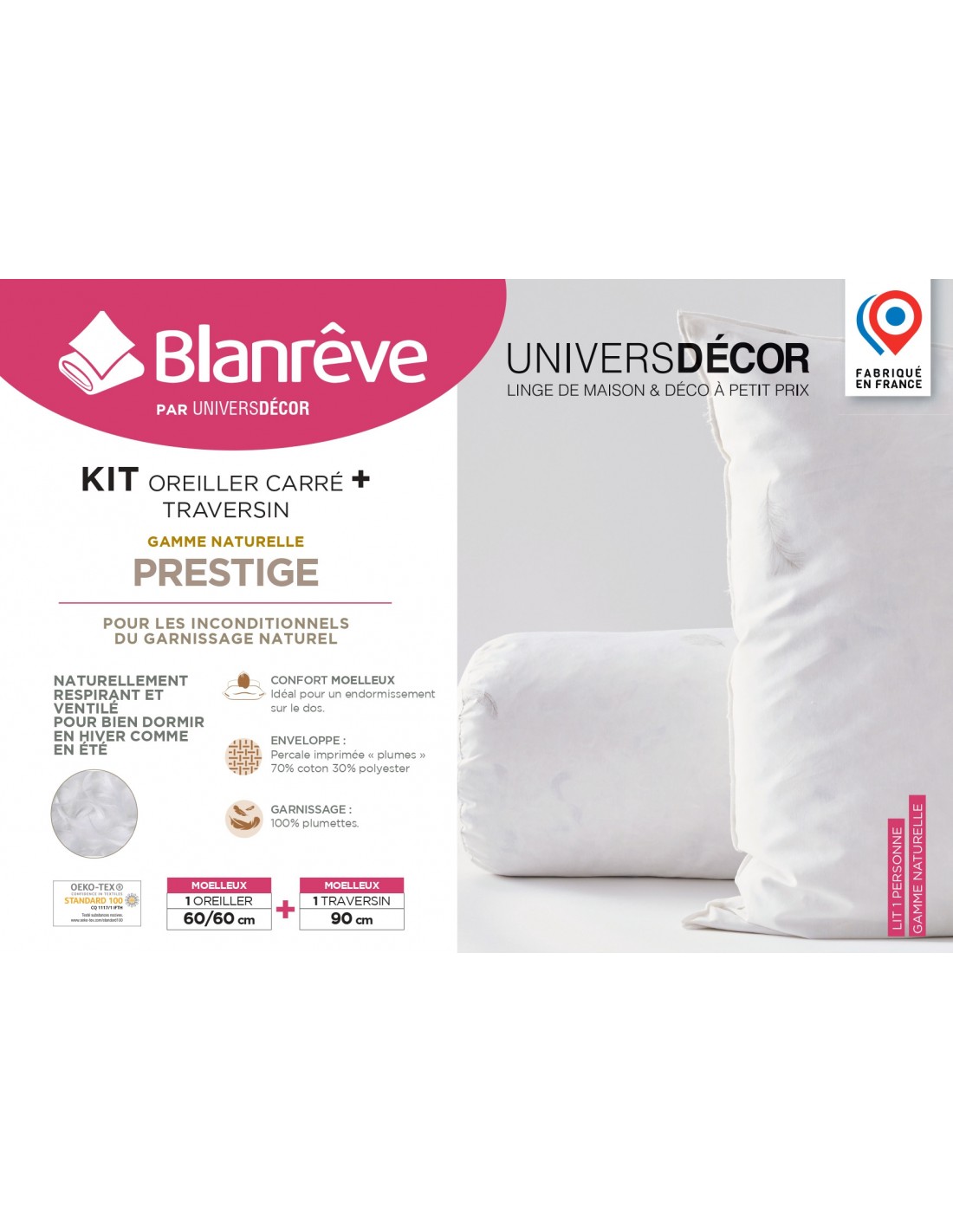 Polochon + Oreiller 60 x 60 Gamme Naturelle "Prestige" plumes véritables pour lit 90 confort moelleux.