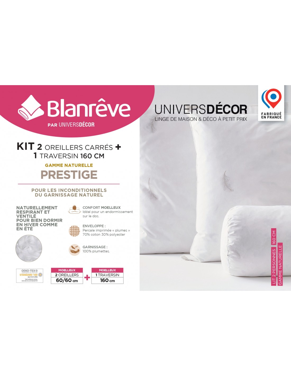 Polochon + 2 Oreillers 60 x 60 Gamme Naturelle "Prestige" plumes véritables pour lit 160 confort moelleux.