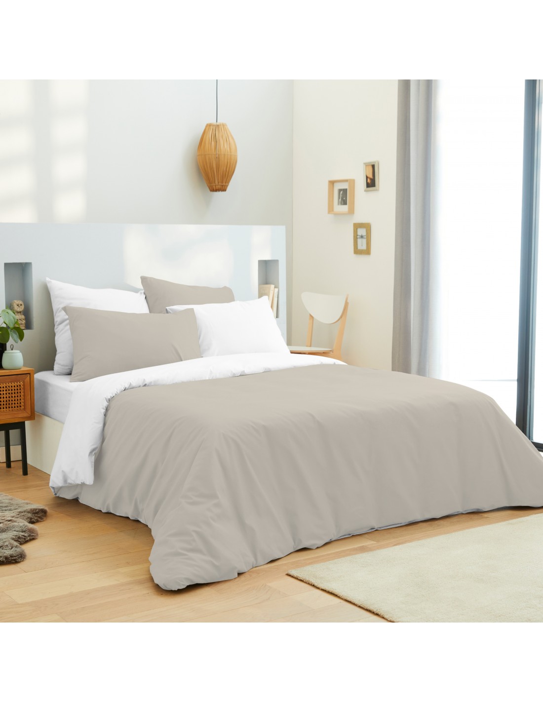 Pack complet 6 pièces Lin/Blanc réversible housse de couette pour lit 140 x 190 cm